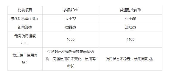 多晶莫來石散棉是由高熔點金屬氧化物微晶體組構成的纖維,它與普通耐火纖維(玻璃纖維、礦棉、硅酸鋁纖維、高鋁纖維)的主要區別見表:
